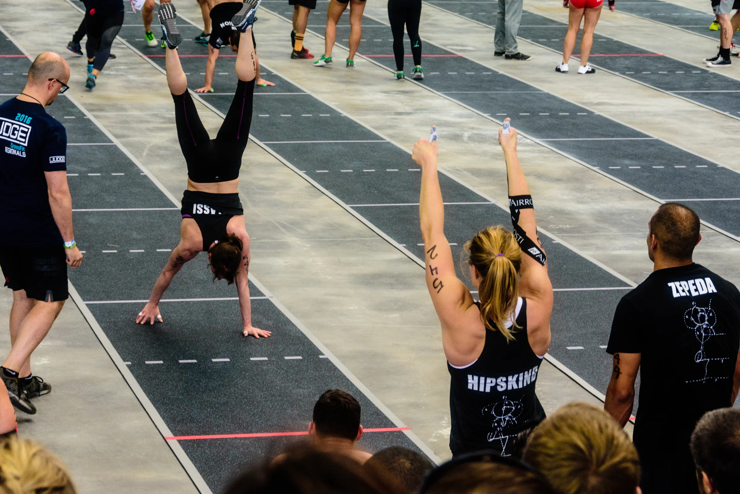 Laurie's Event 7 handstand walk while Cara cheers her on; photo courtesy of Lin Yi