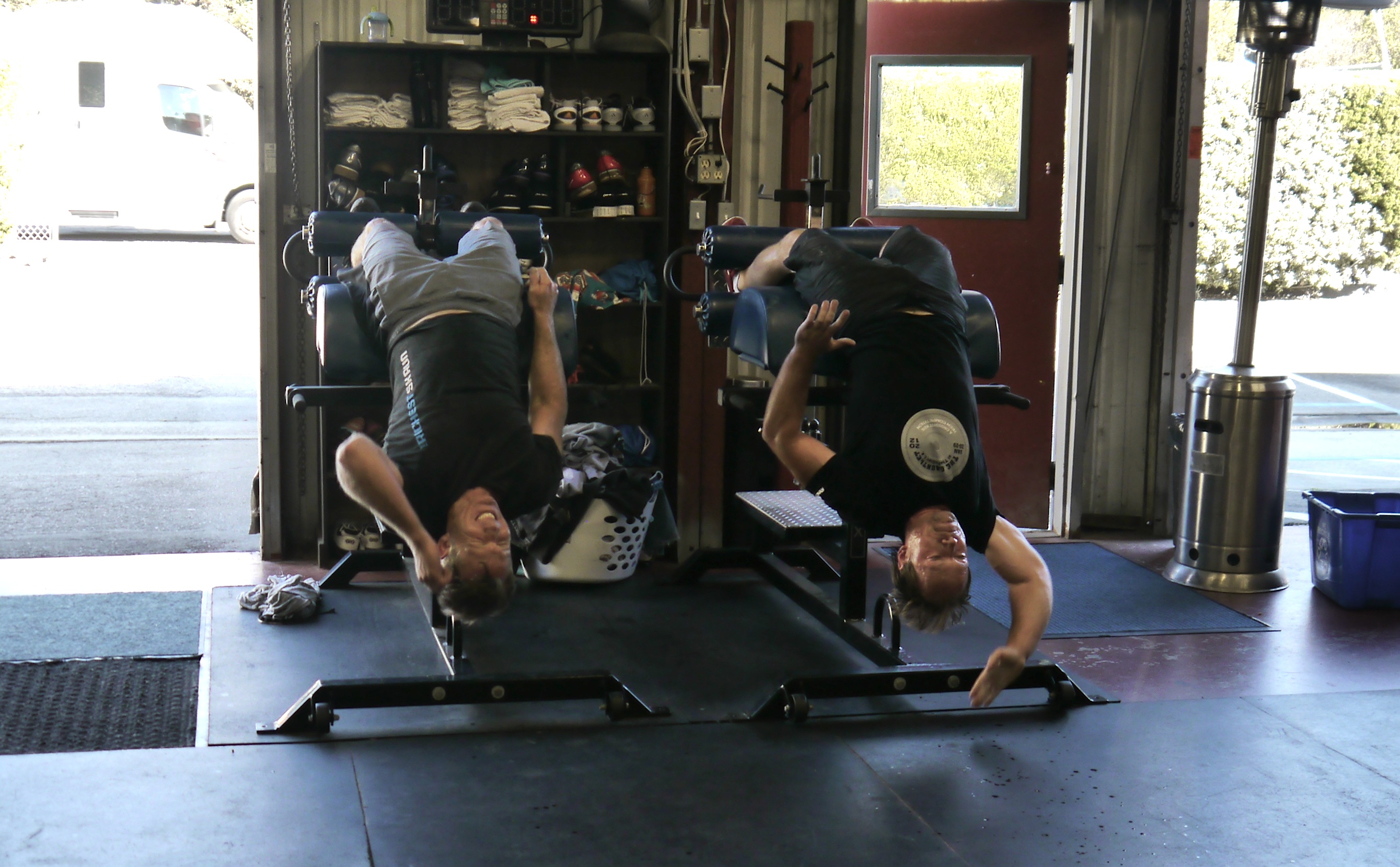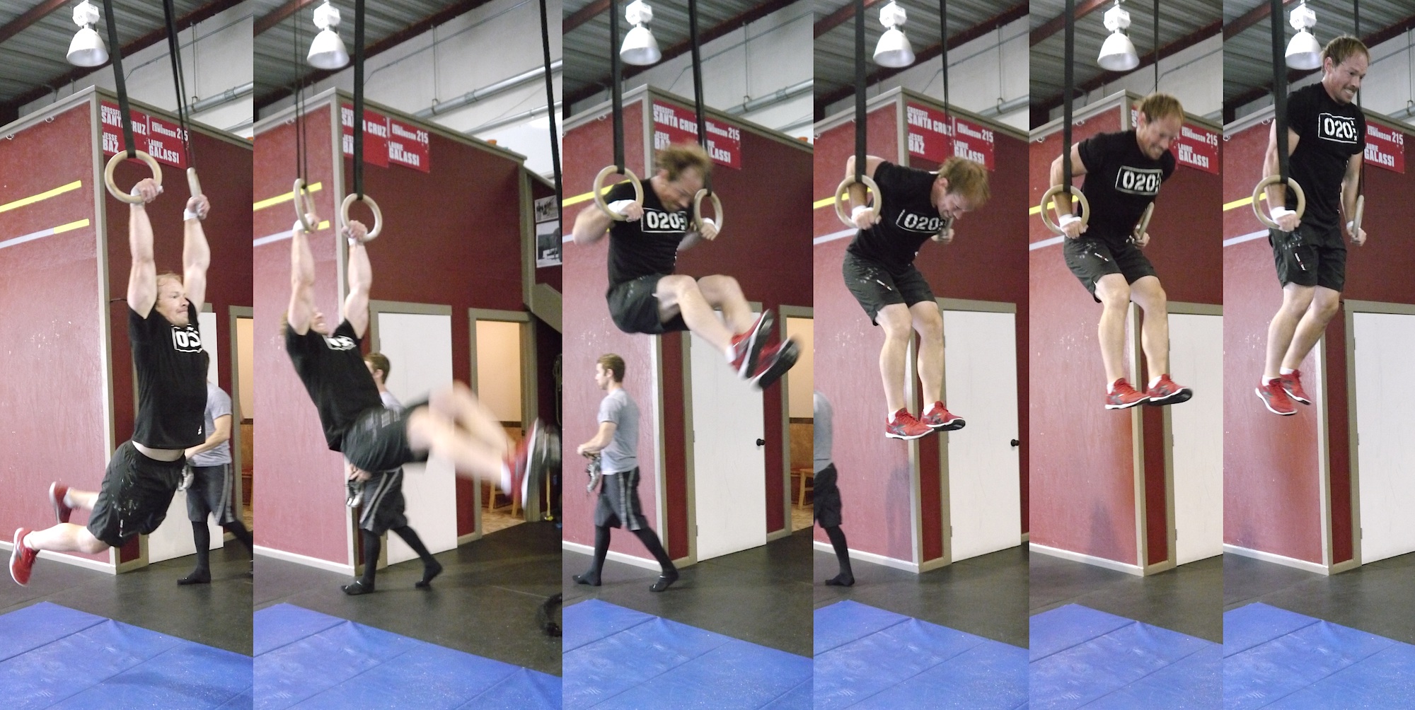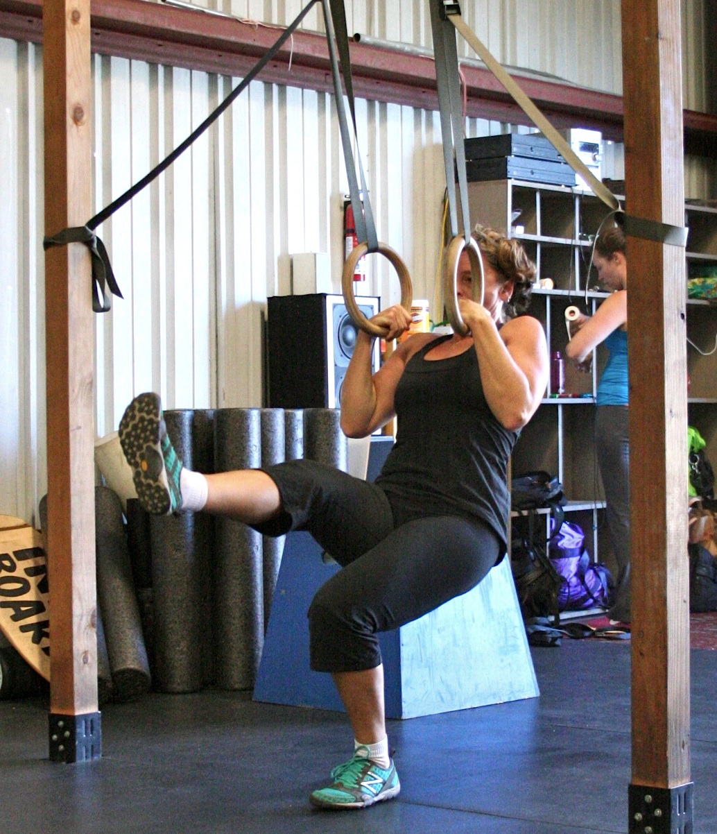 The jumping muscle-ups will be performed on the high rings using boxes and plates to set the appropriate height. For the men, the ring can be as low as the bottom of the ring at bottom of the ear. For the women, the ring can be as low as the bottom of the ring at top of the shoulder. The partner may assist during the handstand push-up.